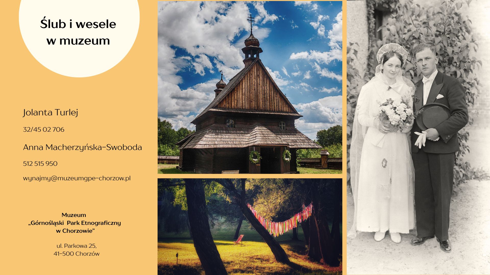 Zapraszamy Państwa do spełniania w przestrzeniach naszego muzeum swoich marzeń o klimatycznym ślubie, weselu, sesji w otoczeniu dawnych wiejskich zabudowań i malowniczych terenów zielonych.